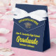 This modern navy blue and yellow personalised graduation party favour box features your high school or college name for the class of 2025. Customise with your graduate name under the chic handwritten script and black grad cap for great personalised favour boxes.