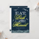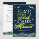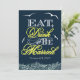 Navy Blue & Yellow Nautical Wedding Invitations--match the RSVP and more found below on this page. Compliment your nautical wedding theme with these invitations that feature birds, ocean waves at the bottom and the popular phrase, "Eat, Drink and Be Married." This design features a navy blue (marine) background with four white birds. The fancy lettering is a combination of yellow and white. The bottom waves are shaded in a very light blue colouring. The back features the same dark blue background with a matching white ornamental wave frame for added flair. These wedding invitations are set to high quality basic card stock; however, you can change the stock to linen, felt (embossed), recycled, and several metallic shades if you would like under number 2 (choose your style, size & paper type) below the orange add to cart button. A list of the additional costs for a fancier card stock are displayed also under that option. Each invitation comes with a fitted white envelope.