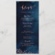 Elegant modern calligraphy menu with rustic floral design in soft blush pink colour on dark navy blue watercolor background, great for modern rustic wedding, spring wedding in evening.