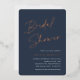 Invite guests to celebrate the bride to be with these modern and minimal bridal shower invitations with stunning rose gold foil accents. Simple design features "bridal shower" in casual handwritten script, with your event details aligned at the right in modern white lettering on a dark navy blue background.