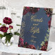 A navy blue and burgundy jewel tone "Cards & Gifts," wedding self-standing pedestal sign featuring a symphony of deep bordeaux, raspberry and burgundy red peonies embellished with gold spray and shimmering gold outlines gather around a navy blue watercolor-wash background with your names and numeric wedding date.