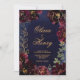 A burgundy navy wedding invitation featuring a symphony of deep bordeaux red peonies adorned with gold spray and shimmering gold outlines gather around a navy blue watercolor wash background with your names large in gold rustic script with an uppercase non serif font announcing your details.