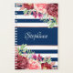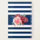 This modern planner features a modern floral design with watercolor burgundy and coral blush flowers and foliage on a navy blue and faux rose gold foil striped background. The back has a matching floral motif. Personalise the monogram with your name or initials.