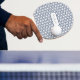 Ping pong paddle with navy circle design, white frame and grey personalisation.
