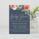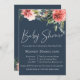 Pretty watercolor floral arrangement in chic shades of navy blue, blush pink, coral and green, baby shower invitation. Personalise text font style, colour, and size. Background colours shown in muted navy blue can be customised as well.