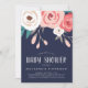 A pretty and modern baby shower invitation in navy, coral and teal, featuring hand drawn flowers and brush lettered style font.