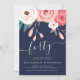 A pretty birthday party invitation combining florals with typography. This design features a large top bouquet in coral, white and pink,"forty" in pretty modern calligraphy style script font, on a background of navy blue. Party details are in white modern sans serif font. The reverse is in teal green with a trellis pattern overlaid.