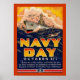 Vintage bright design showing a military ship cutting through the waves. "Navy Day" below in gold. Colours are an orange red and blue.