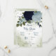 beautiful romantic navy and dusty blue flowers and green leaves botanical greenery save the date invitation