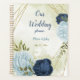 Beautiful wedding planner featuring navy and dusty blue flowers and green leaves