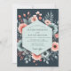 A rich navy backdrop is adorned with a cascade of ethereal blossoms in soft coral, blush, and muted teal hues. Delicate foliage adds depth to this romantic, artistic arrangement, evoking a sense of enchanting mystique.