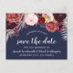 Navy Fall Marsala Blush Peony Save The Date Cards - features a navy blue background with various peonies, roses, and other floral elements in shades of Marsala, burgundy, blue pink, grey and more. See the matching collection on this page to complete the look for your event.