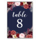 Navy Fall Marsala Peony Wedding Table Number Cards - design features a navy blue background with various peonies, roses, and other floral elements in shades of Marsala, burgundy, blue pink, grey and more. See the matching collection on this page to complete the look for your event.
