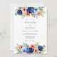 This design features a beautiful arrangement of deep blue blooms and coral accents, intertwined with lush greenery. The painterly strokes create a romantic and artistic feel, perfect for a special occasion.