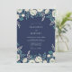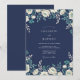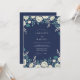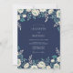 A deep navy background serves as the canvas for an elegant scrollwork floral design. Delicate blooms in cream and soft teal intertwine with leafy flourishes, creating a sophisticated and romantic atmosphere. The arrangement evokes a classic, artful feel for a memorable occasion.