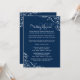 Create a polished and timeless look for your rehearsal evening with this navy wedding rehearsal dinner invitation. White scrollwork flourishes and refined calligraphy frame a charming rhyming poem that walks guests through the ceremony practice and dinner to follow. The classic navy background pairs perfectly with the crisp white accents. Every detail is fully editable to match your wedding style.