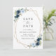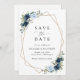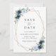 Invite friends and family in style and set the tone for your special day with this charming save the date card. Design features navy and blue watercolor flowers, greenery and gold frame on white background.