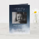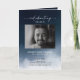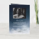 Funeral memorial program featuring on the front a photo of the deceased, their name, dates, the memorial venue, date of the event, and elegant navy blue fog background. On the inside is an obituary, and order of service; and on the back another photo, a thank you note and the second venue for after the funeral. For further customisation, please click the "Edit using Design Tool" link and use our design tool to modify this template. If you need help or matching items, please contact me.