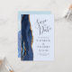 This elegant modern save the date card features a navy blue watercolor agate border trimmed with faux gold glitter. The customisable text is charcoal grey on a pale blue background. Easily replace the sample image on the back of the card with your vertical photo.