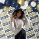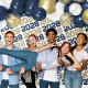 Dark Blue and Taupe Gold on White Repeating Tapestry Backdrop. Use the "personalise" option to change to any class year.