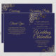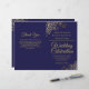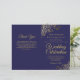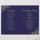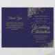 This combination wedding invitation and program features an elegant navy blue and gold design with delicate faux foil curls and swirls in the corners. The front features the invitation, while the inside has the ceremony and bridal party details. The back has space for a thank you note.