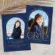 This navy blue and gold simple minimalist arch graduation announcement features a delicate arch frame, 2 photo templates and elegant modern typography.