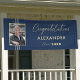 This Class of 2025 stylish graduation party banner features gold stripes and frame around the graduate's photo and a navy blue background.