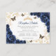 Navy gold Quinceanera reception details enclosure cards. Features, script font, gold butterflies, watercolor roses and tiara. Perfect for an elegant princess style glam celebration. Personalize with your own details.
