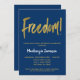 An elegant, simple but striking navy blue and gold retirement party invitation. Glam script text at the top that says "Freedom!" with gold text below and the name in stand-out white