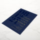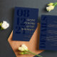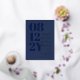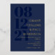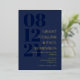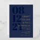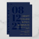 Elegant typography wedding invitation in navy blue with your wedding date in large dark blue numbers down the side of the invitation. Add names and wedding wording in gold foil. Gold foil and dark blue wedding invitation with your names in a large font. Double sided wedding invitation with your invitation in gold foil on one side, and your wedding details printed with a tan colour on navy blue on the other side.