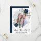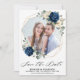 Dark navy blue floral save the date card featuring elegant bouquet of navy blue, royal blue , white , gold, champagne ivory, blush colour rose , hydrangea, ranunculus, peony, flower buds and sage green eucalyptus leaves and elegant watercolor with round glitter geometric neutral frame. Please contact me for any help in customisation or if you need any other product with this design.