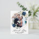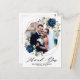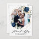Dark navy blue floral wedding thank you photo postcard featuring elegant bouquet of navy blue, royal blue , white , gold, champagne ivory, blush colour rose , hydrangea, ranunculus, peony, flower buds and sage green eucalyptus leaves and elegant watercolor with round glitter geometric neutral frame. Please contact me for any help in customisation or if you need any other product with this design.