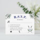 A golf themed retirement party RSVP card in white, navy blue and green with greenery and a golf ball and crossed golf clubs. Add your initial to the golf ball for a golf themed monogram. Ask your guests to initial meal choice next to the chicken or the vegetable icons.