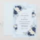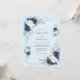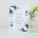 This design features a sophisticated palette of deep navy and crisp white roses paired with soft watercolor foliage. The light blue background creates a serene and elegant atmosphere perfect for a formal event. Delicate anemones and silver dollar eucalyptus leaves add a touch of botanical grace. This aesthetic is ideal for a cool-toned nuptial.