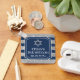 This navy blue, grey, and white striped Bar Mitzvah keychain is a perfect party favour for a classic Bar Mitzvah. This square Bar Mitzvah keychain favour has a navy blue and grey striped pattern behind a navy blue and white trimmed ticket-shaped text area that is personalised with the name and date of the Bar Mitzvah in white lettering below a grey Star of David at the top which can be removed if you want to use these for another type of event.