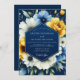 This elegant design features a vibrant arrangement of flowers. Painterly marigold yellow peonies, ivory anemones, and blue blossoms pop against a deep navy background. Lush green foliage completes this artistic and romantic composition. The striking contrast creates a beautifully dramatic and memorable aesthetic for your special day.