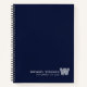 Elevate your daily planning with this modern minimalist notebook, designed in a clean navy blue-and-white colour palette that suits both professional and personal use. Your custom name appears in the lower right corner in a refined line-style font, paired with a striking monogram initial created in the distinctive Monoton typeface. With its simple, contemporary layout this personalised notebook stands out for its sleek, stylish design. Perfect as a custom business notebook, journalling companion, or thoughtful personalised gift, it offers fully customisable text and monogram options to match your unique style. Ideal for professionals, students, creatives, and anyone who loves modern stationery.