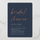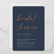 Invite guests to celebrate the bride to be with these modern and minimal bridal shower invitations with stunning rose gold foil accents. Simple design features "bridal shower" in casual handwritten script on a soft navy blue background, with your event details aligned at the lower left in modern off white lettering.