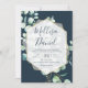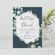 Wedding Invitation featuring delicate hand-painted watercolor eucalyptus leaves adorned by a modern white gold geometric frame, set against a navy background with navy text.