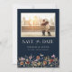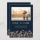 Navy Blue Modern Photo Boho Save The Date. This stylish & elegant wedding save the date features gorgeous hand-painted watercolor wildflowers arranged as a lovely bouquet perfect for spring, summer, or fall weddings. Find matching items in the Navy Blue Boho Wildflower Wedding Collection.