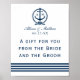 Thank your guests with this navy nautical "A Gift for You from the Bride and the Groom" sign featuring a classic anchor and rope monogram crest with the couple's initials. The crisp navy and white design with stripe accents makes a polished addition to your wedding favor or gift table. Coordinates with the full nautical anchor sign collection. All text and monogram initials are fully customizable.