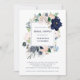 This stylish bridal shower invitation features a frame of navy blue, light blue, and blush pink watercolor flowers with green and neutral beige leaves. The back of the card has elegant navy blue and white nautical stripes.