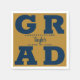 GRAD in bold navy blue lettering on gold background graduation party napkins with Congratulations above the name of your graduate and the Class of below. SEE ENTIRE COLLECTION of pre-done color combinations and more in our store.