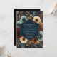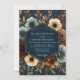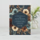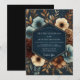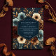 Deep navy tones are enriched with opulent blooms in cream, rust, and muted blue hues. This design evokes a sense of refined elegance with its lush, painterly floral arrangements and rich colour palette. The artistic composition suggests a sophisticated, dramatic aesthetic for a memorable occasion.