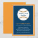 A bold baseball with orange stitching bursts against a distressed navy background on this sporty birthday invitation, with customisable party details and an orange backing. A fun choice for baseball fans, ballpark birthday celebrations, surprise parties, and sports-themed milestone events for men and boys of any age. All text including name, age, and event details is fully customisable.
