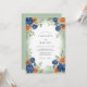 Vibrant navy blue and burnt orange watercolor florals create a sophisticated yet earthy aesthetic. This design features lush navy blue poppies and terracotta roses nestled among soft sage green foliage. Ideal for an autumnal or late summer outdoor event, the artwork evokes a sense of natural beauty and elegance. A subtle wash of pale green provides a soft backdrop for the rich, saturated blooms.