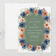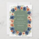 This design showcases a lush botanical arrangement of deep navy blue anemones and vibrant peach poppies. Set against a muted sage green backdrop, the artwork evokes a rich and moody autumnal atmosphere. Delicate burgundy berries and varied leaf foliage provide a sophisticated, earthy touch for a rustic wedding theme.