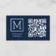 This business card features a minimal monogram logo design on a navy background with QR code on the front. Personalise it with your own text.