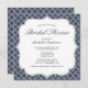 A chic navy blue bridal shower invitation with a classic script font and pretty quatrefoil pattern.