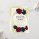 Beautiful birthday party invitation featuring dark navy blue and red flowers and gold leaves .